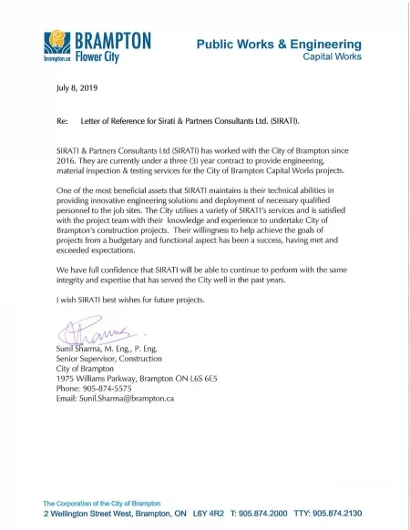 SIRATI & Partners Consultants Ltd (SIRATI) has worked with the Cir  of Brampton since 20J 6. They are currently under a three (3) year contract to provide engineering, material inspection & testing services for the Cir of Brampton Capital Works projects.
